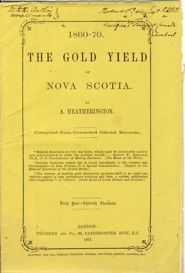 1860-1870. The Gold Yield of Nova Scotia. Compiled from Corrected Official Records. Sixth Year ...